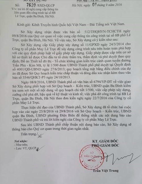 Đưa ra câu hỏi liên quan tới vụ 8B Lê Trực, Đài truyền hình Quốc hội – Đài tiếng nói Việt Nam có văn bản gửi tới Sở Xây dựng 2 câu có nội dụng: Thứ nhất, UBND thành phố đã phê duyệt điều chỉnh quy hoạch tại Quyết định số 2452/QĐ-UBND ngày 05/12/2008 cho toà nhà 8B Lê Trực xây cao 70m với 20 tầng. Vậy dựa vào căn cứ pháp lý nào Sở Xây dựng Hà Nội ra quyết định cho phép chủ đầu tư xây dựng công trình 18 tầng, chiều cao công trình 53m?