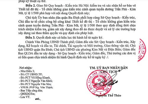 GPXD hoàn toàn phù hợp với thiết kế đô thị - tổ chức không gian kiến trúc cảnh quan tuyến đường Trần Phú - Kim Mã, tỷ lệ 1/500 tại Quyết định số 4001/QĐ-UBND ngày 27/6/2013 của UBND thành phố Hà Nội phê duyệt, người ký duyệt là Chủ tịch Nguyễn Thế Thảo.