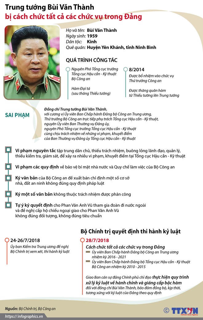 (PLO) - Ngày 28/7/2018, Bộ Chính trị quyết định thi hành kỷ luật đồng chí Bùi Văn Thành bằng hình thức Cách chức tất cả các chức vụ trong Đảng, giao Ban cán sự đảng Chính phủ chỉ đạo thực hiện quy trình xử lý kỷ luật về hành chính và giáng cấp bậc hàm đối với đồng chí Bùi Văn Thành, bảo đảm đồng bộ, kịp thời, tương xứng với kỷ luật của Đảng theo quy định.