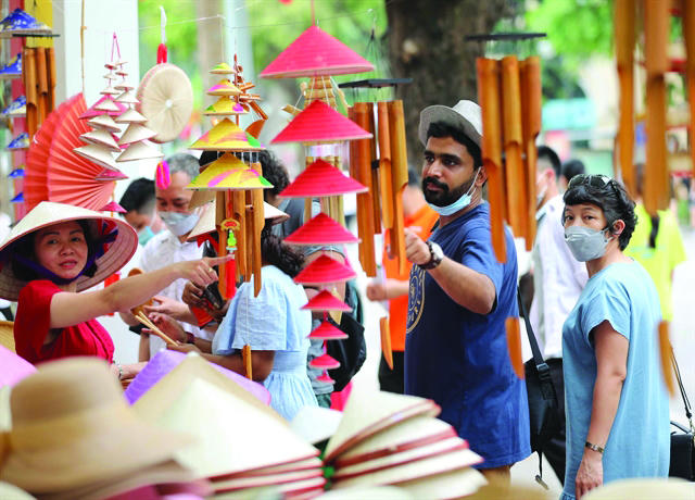 Du khách Ấn Độ muốn mua đồ lưu niệm tại một gian hàng trên phố đi bộ gần Hồ Hoàn Kiếm. (Ảnh: VNA) |