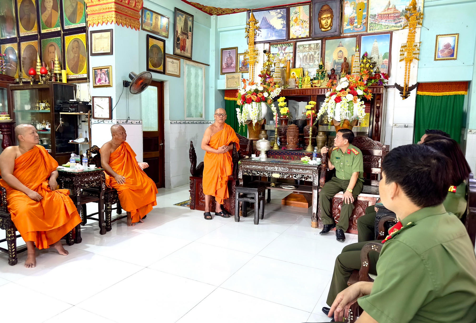 Hòa thượng Hữu Hinh thường xuyên phối hợp với lực lượng Công an thực hiện công tác an sinh xã hội, giảm nghèo bền vững trong phum sóc. |