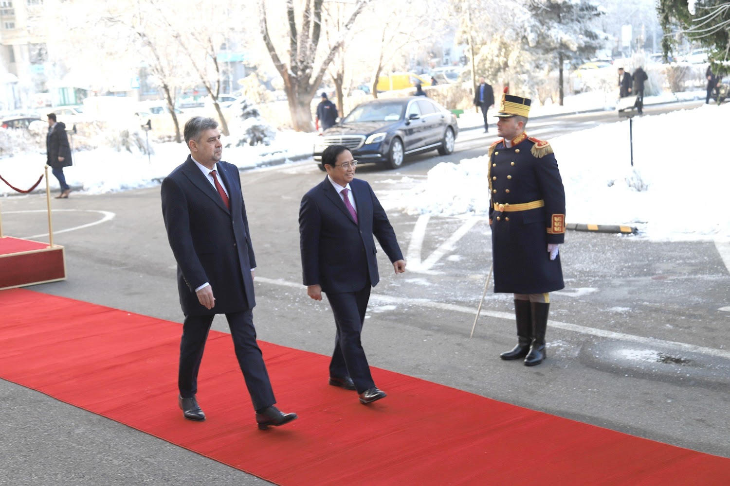 Thủ tướng Ion-Marcel Ciolacu chủ trì lễ đón Thủ tướng Phạm Minh Chính thăm chính thức Romania - Ảnh: VGP/Nhật Bắc