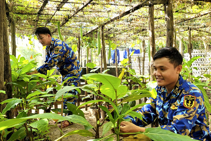 Cây xanh ở đây được cán bộ, chiến sĩ trồng và chăm sóc cũng rất sáng tạo. Các loại cây, loại hoa được trồng trong chậu, sắp xếp ngay ngắn, có gắn biển “Vườn hoa thanh niên”. Đây không phải là vườn hoa cố định một vị trí mà là những “vườn hoa di động”, sẽ được di chuyển đến các vị trí khác nhau theo từng mùa để tránh sóng và gió biển.