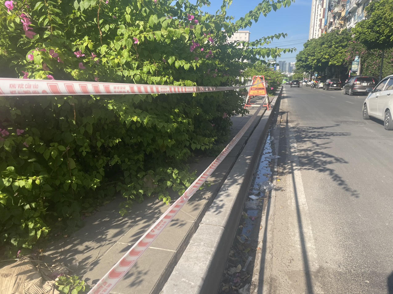 Đoạn vỉa hè sụt lún đã được căng dây và đặt biển cảnh báo.