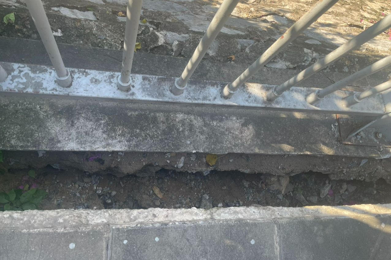 Vỉa hè sụt lún khiến phần lan can nghiêng hẳn sang phía mương thoát nước.