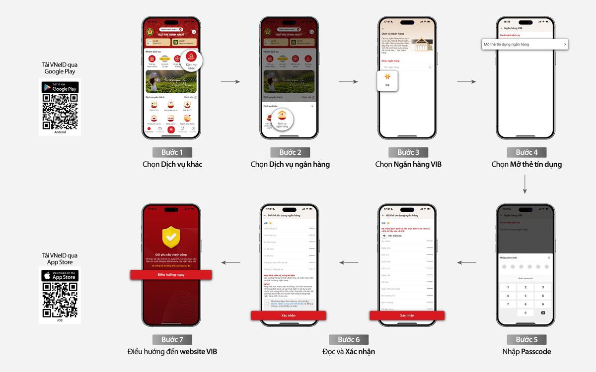 Để mở thẻ tín dụng VIB từ ứng dụng VNeID, khách hàng cần cài đặt VNeID qua App Store và Google Play và kích hoạt tài khoản VNeID định danh mức 2. Trên ứng dụng VNeID, khách hàng đăng ký mở thẻ qua 7 bước gồm Chọn dịch vụ khác > Chọn dịch vụ ngân hàng > Chọn ngân hàng VIB > Chọn mở thẻ tín dụng > Nhập mật mã > Đọc và xác nhận > Điều hướng đến Website VIB và làm theo hướng dẫn. Để hoàn tất thủ tục đăng ký sản phẩm, khách hàng chỉ cần đồng ý chia sẻ dữ liệu trên ứng dụng VNeID với VIB.