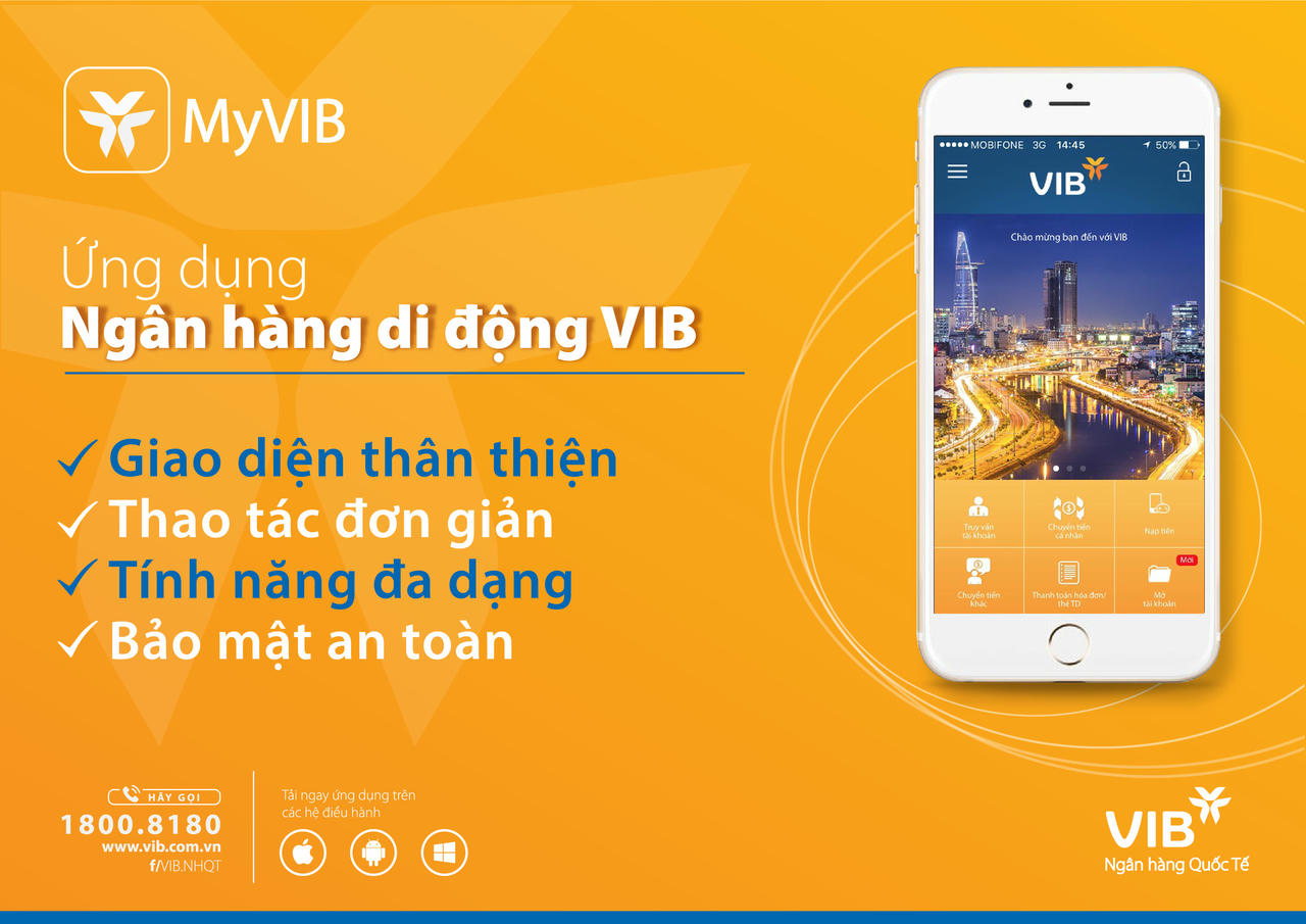 Với ứng dụng ngân hàng di động MyVIB trên chiếc điện thoại thông minh, khách hàng có thể sử dụng các dịch vụ ngân hàng mà không cần đến chi nhánh như mở tài khoản, chuyển tiền, thanh toán hóa đơn, gửi tiết kiệm trực tuyến, quản lý thẻ tín dụng, theo dõi & thanh toán dư nợ tín dụng….tại mọi nơi, mọi lúc. Giao diện thân thiện, dễ sử dụng cùng cơ chế an toàn bảo mật cao, ứng dụng MyVIB mang đến cho khách hàng những trải nghiệm tuyệt vời trong việc quản lý tài chính cá nhân.