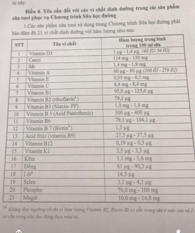 Theo Thông tư 31, nguyên liệu của sữa học đường phải là sữa tươi. Bên cạnh đó, sữa học đường phải bổ sung 21 vi chất dinh dưỡng. Được biết, Ban Cán sự Đảng Bộ Y tế đã có cuộc họp, thống nhất việc đưa ra quy định bổ sung 21 vi chất đối với sữa học đường, căn cứ trên cơ sở đề xuất của Viện Dinh dưỡng.