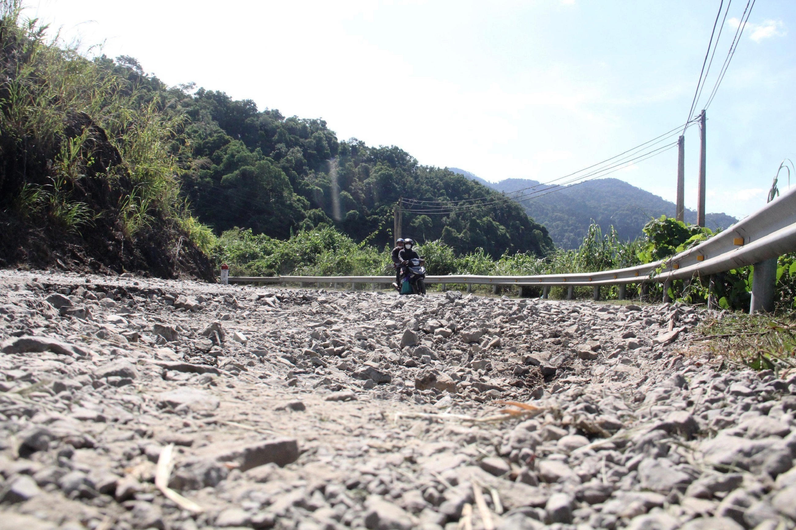 Xe máy, ô tô đều lưu thông khó khăn trên QL14D. |