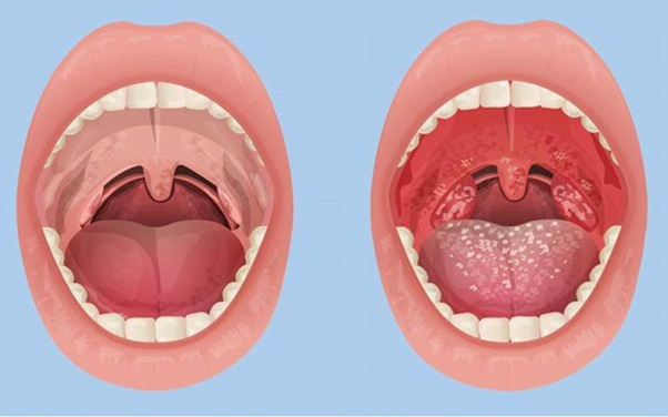 - Viêm họng do liên cầu khuẩn: Đau họng, khó nuốt, sốt cao trên 38 độ C, phát ban, đau cơ. Có hạch sưng to kèm các mảng trắng hoặc vòm họng xuất hiện chấm đỏ li ti...
