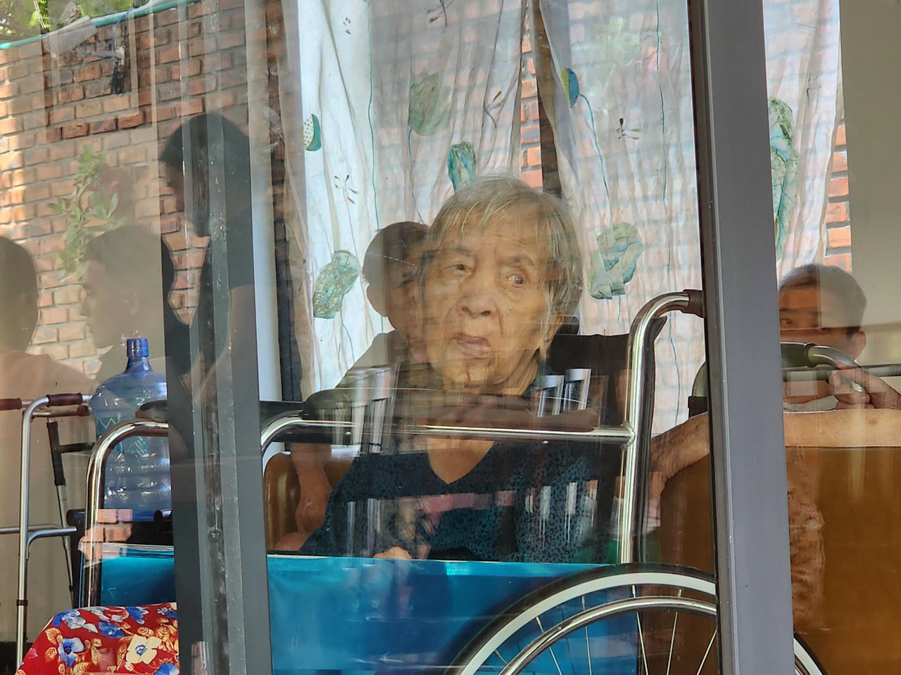 Cụ già ngồi xe lăn nhìn ra ngoài với ánh mắt suy tư. |