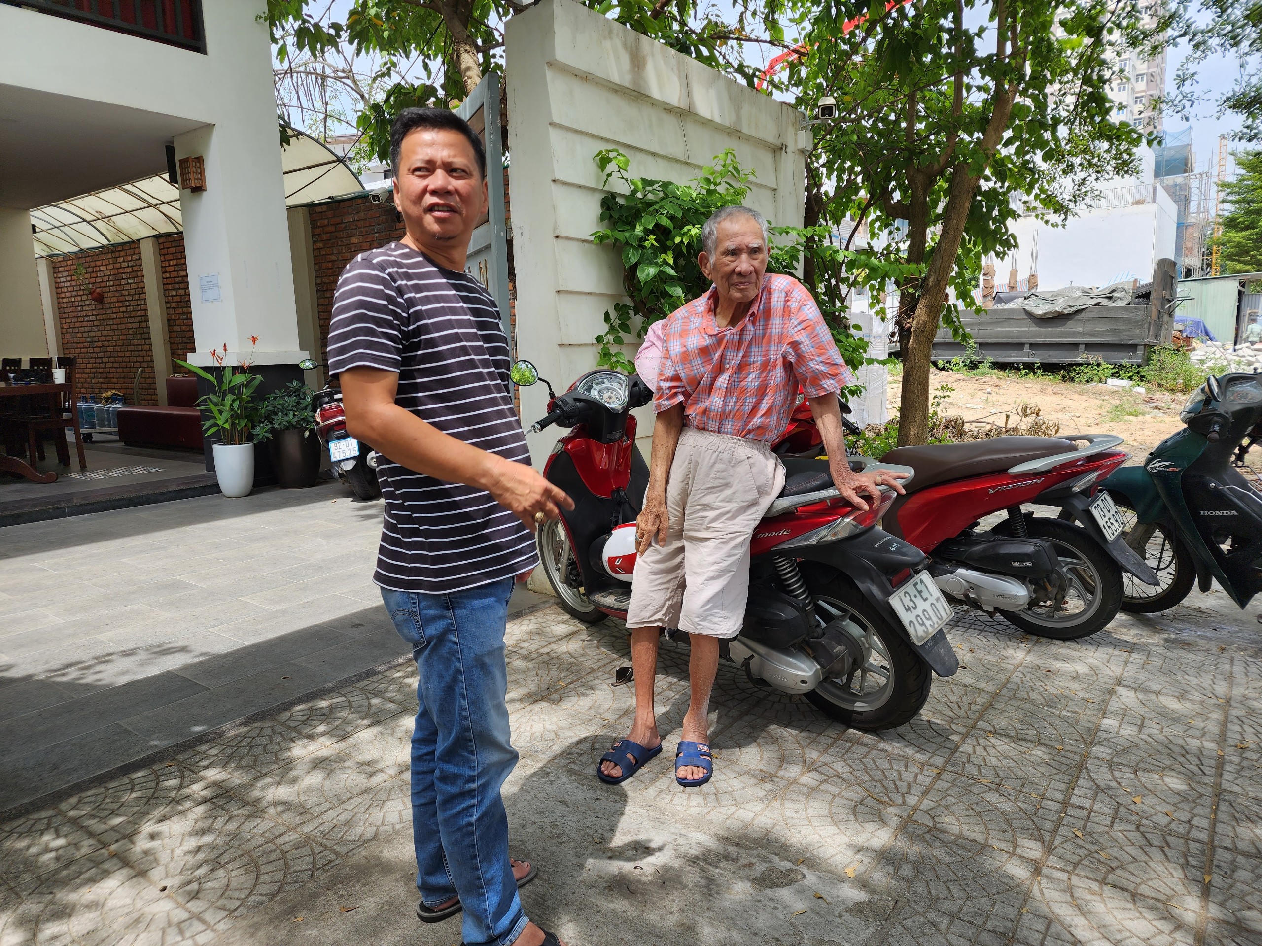 Cụ ông gần 100 tuổi được gia đình đến đón về dưới cái nắng oi bức. |