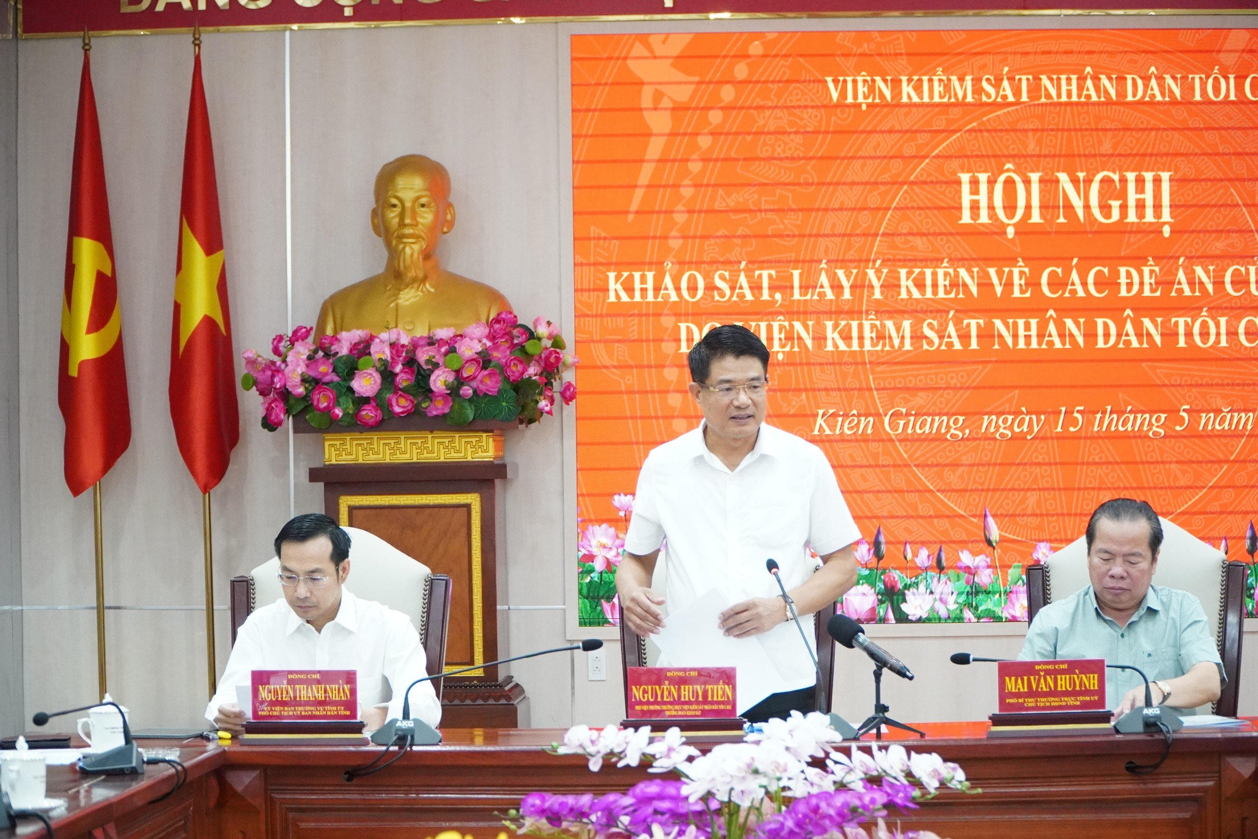 Ông Nguyễn Huy Tiến - Phó Viện trưởng Thường trực VKSNDTC, ông Mai Văn Huỳnh – Phó Bí thư Thường trực Tỉnh ủy, Chủ tịch HĐND tỉnh Kiên Giang đồng chủ trì hội nghị.