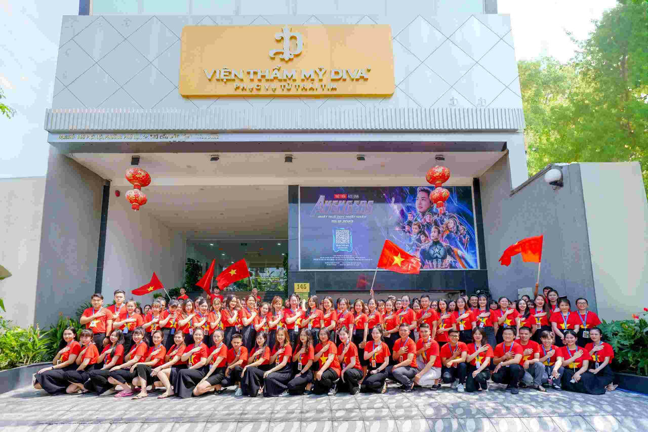 Bên cạnh đó, nhằm chào đón Đại lễ - Ngày Giải phóng hoàn toàn miền Nam thống nhất đất nước (30/04) và Ngày Quốc tế Lao động (01/05), toàn thể nhân viên Viện thẩm mỹ DIVA đã cùng nhau mặc áo cờ Tổ quốc với hình ảnh lá cờ đỏ sao vàng rực rỡ.