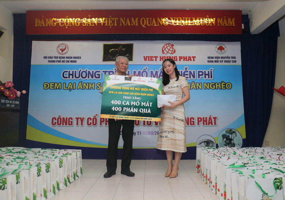 Theo đó, trong 2 ngày 11 và 12 tháng 8, Công ty Việt Hưng Phát phối hợp với thương hiệu Áo zài ABC, Hội bảo trợ bệnh nhân nghèo TP.HCM, NSND Kim Cương cùng Bệnh viện Nguyễn Trãi đã tổ chức chương trình “Mổ mắt miễn phí đem lại ánh sáng cho 400 bệnh nhân nghèo”. Các bệnh nhân này không chỉ được mổ mắt miễn phí, mà còn được trao tặng những phần quà đầy ý nghĩa từ những tấm lòng của các nhà tài trợ.