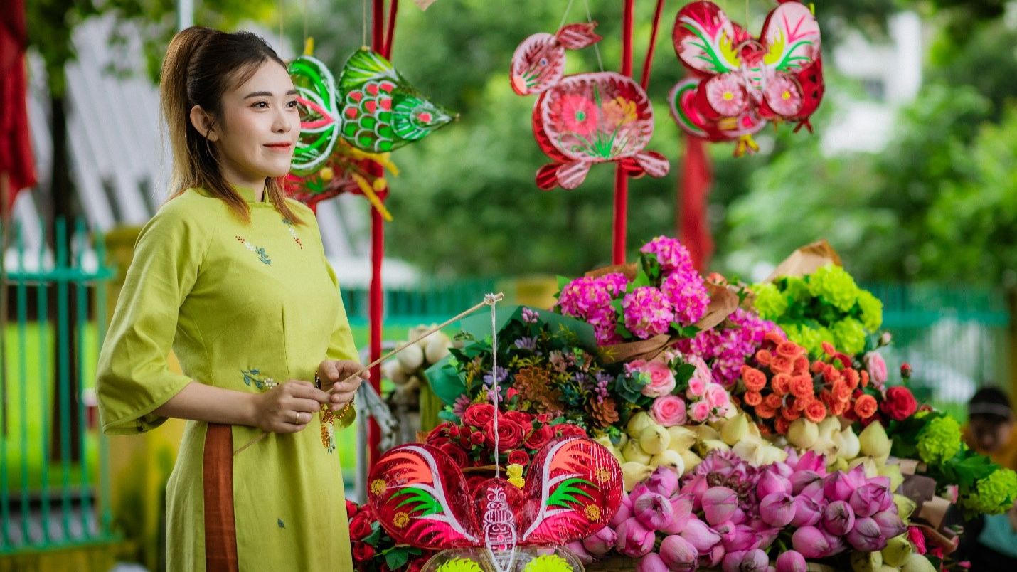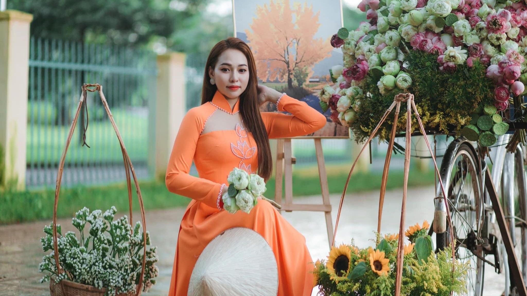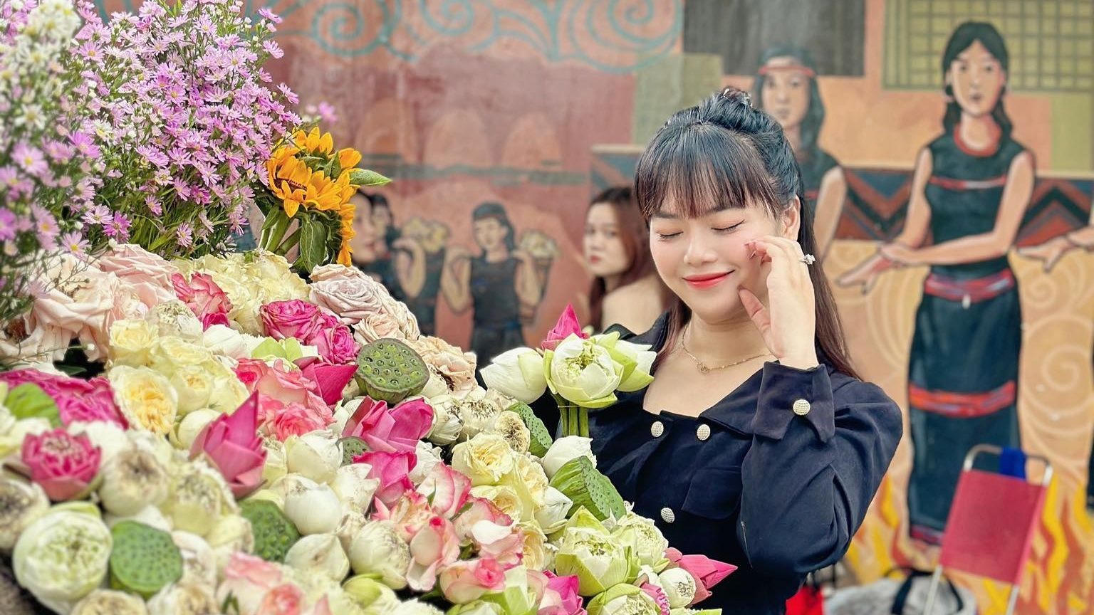 Chị Huynh Nym rất thích cách decor trên đường phố Phan Đình Giót với những xe đạp, xe máy cũ chở đầy hoa và hoa sen là loại chị rất thích (ảnh: Đại Đậu) |