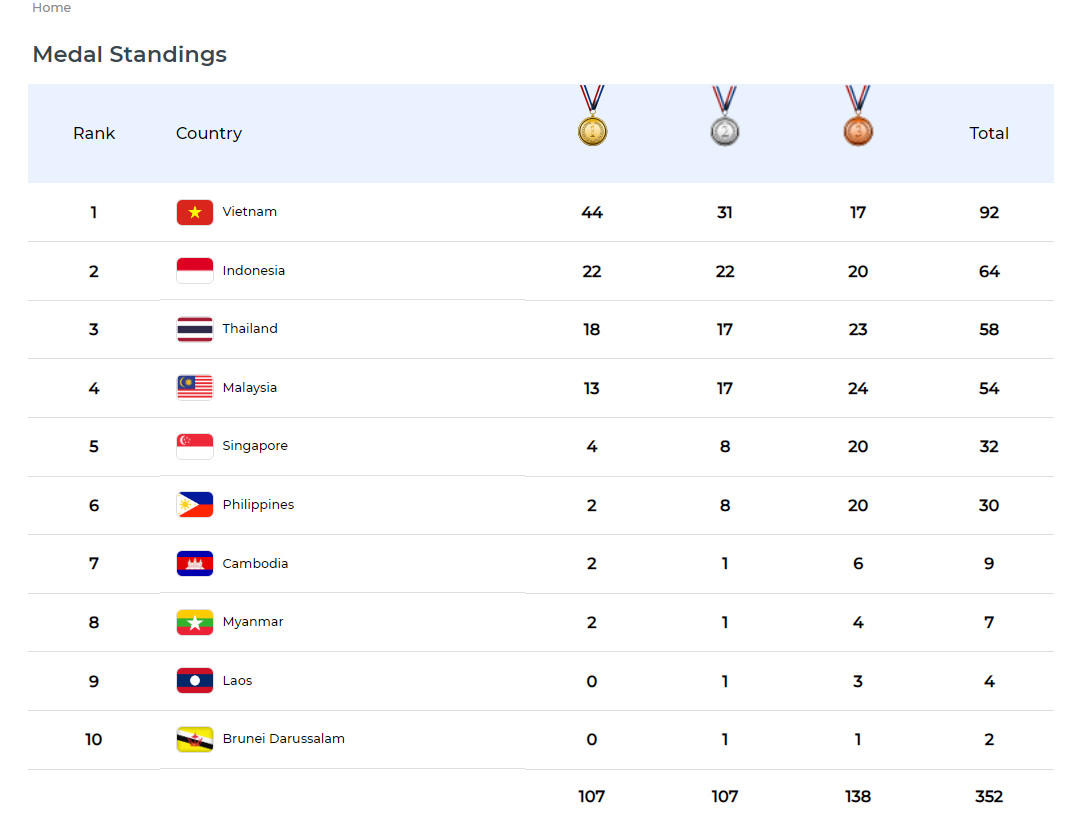Kết thúc đại hội, Việt Nam xuất sắc dẫn đầu toàn đoàn với tổng cộng 44 huy chương vàng, xếp thứ hai là Indonesia với 22 huy chương vàng và xếp thứ ba là Thái Lan với 18 huy chương vàng.