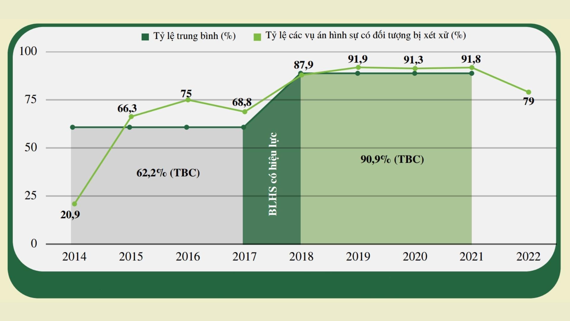 Tỷ lệ các vụ án hình sự về ĐVHD được đưa ra xét xử cũng tăng đáng kể. Trong bốn năm sau khi BLHS sửa đổi có hiệu lực (2018 - 2021), trung bình tỷ lệ các vụ án có đối tượng bị bắt giữ được đưa ra xét xử là 90,9%, tăng gần 30% so với giai đoạn trước khi BLHS có hiệu lực với mức trung bình chỉ đạt 62,2%.
