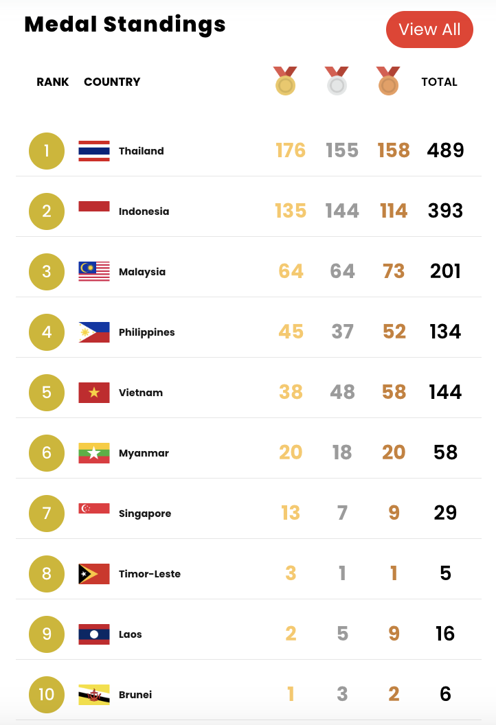 Chung cuộc, Đoàn Thể thao Người khuyết tật Việt Nam giành tổng cộng 144 huy chương, gồm 38 HCV, 48 HCB và 58 HCĐ, hoàn thành nhiệm vụ Top 5 trên bảng tổng sắp huy chương ASEAN Para Games 13. Ở vị trí dẫn đầu, chủ nhà Thái Lan sở hữu 175 HCV, 155 HCB và 157 HCĐ, xếp hạng hai là Indonesia với 134 HCV, 143 HCB và 144 HCĐ.