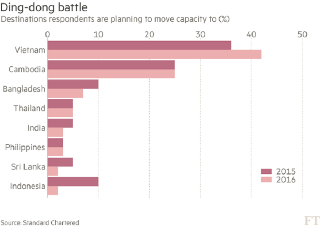 Những nhà sản xuất này cho rằng họ có thể giảm chi phí sản xuất khoảng 20 đến 25% với việc chuyển ra nước ngoài, trong đó Bangladesh đặc biệt được xem là một lựa chọn rẻ. Tuy nhiên Việt Nam hơn hẳn các đối thủ tiềm năng ở các khía cạnh nguồn cung lao động, những khuyến khích về thuế, chi phí kinh doanh nằm ngoài lương, triển vọng kinh tế, sự gần gũi với các khách hàng mới và các lợi ích liên quan đến các thỏa thuận thương mại.