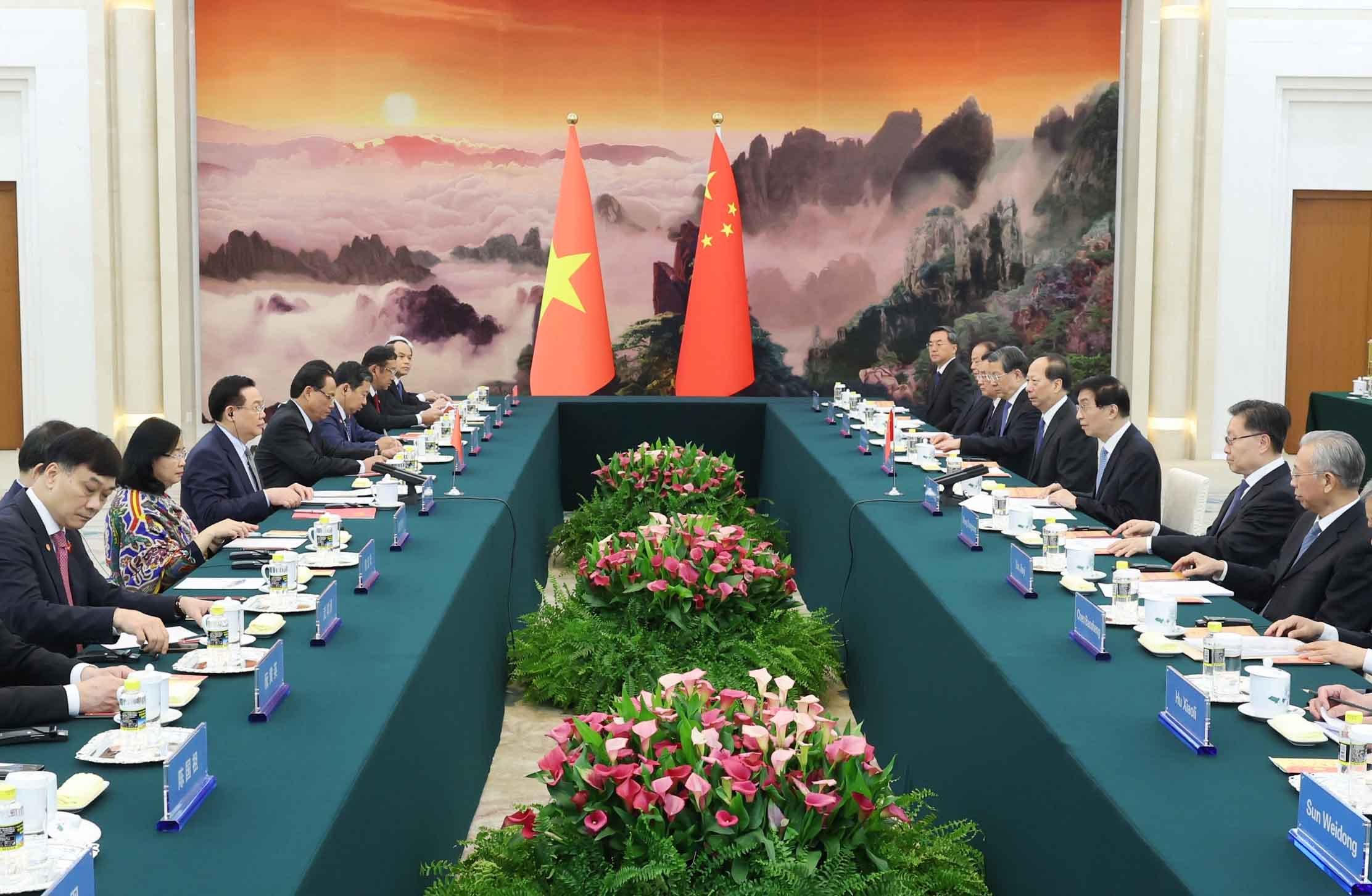 Chủ tịch QH đề nghị hai bên tiếp tục duy trì trao đổi, tiếp xúc cấp cao thường xuyên; thúc đẩy hợp tác thương mại tăng trưởng theo hướng cân bằng, bền vững; tăng cường hợp tác, kết nối trong lĩnh vực đường bộ, đường sắt, khuyến khích doanh nghiệp Trung Quốc đầu tư các dự án quy mô lớn, chất lượng cao, tiêu biểu cho trình độ phát triển của Trung Quốc, nhất là trong các lĩnh vực phát triển xanh, kinh tế số, chuyển đổi số, dữ liệu số, biến đổi khí hậu, bảo vệ môi trường; ủng hộ các cơ chế giao lưu hợp tác của các địa phương; khai thác hiệu quả tiềm năng to lớn về hợp tác du lịch; tổ chức tốt các hoạt động gặp gỡ hữu nghị, giao lưu Nhân dân như Liên hoan Thanh niên, Diễn đàn Nhân dân, giao lưu giữa các thành viên của Mặt trận Tổ quốc Việt Nam và Chính hiệp toàn quốc Trung Quốc như công đoàn, phụ nữ.