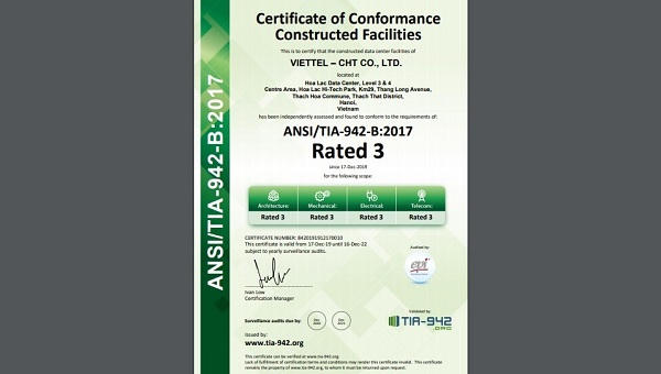 Với việc được cấp chứng chỉ này, Viettel IDC đã chính thức thành nhà cung cấp đầu tiên và duy nhất tại Việt Nam được đánh giá và cấp chứng nhận đạt tiêu chuẩn ANSI/TIA-942 Rated 3 về triển khai và vận hành TTDL (Constructed Facilities). Điều này đồng nghĩa với việc Việt Nam là số ít (5/11) quốc gia tại Đông Nam Á có TTDL đạt chuẩn của Thế giới.