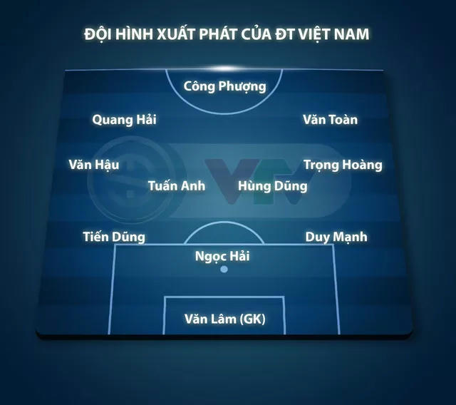 Đội hình ra sân của đội Tuyển Việt Nam Văn Lâm, Duy Mạnh, Ngọc Hải, Tiến Dũng, Trọng Hoàng, Văn Hậu, Hùng Dũng, Tuấn Anh, Văn Toàn, Công Phượng, Quang Hải.