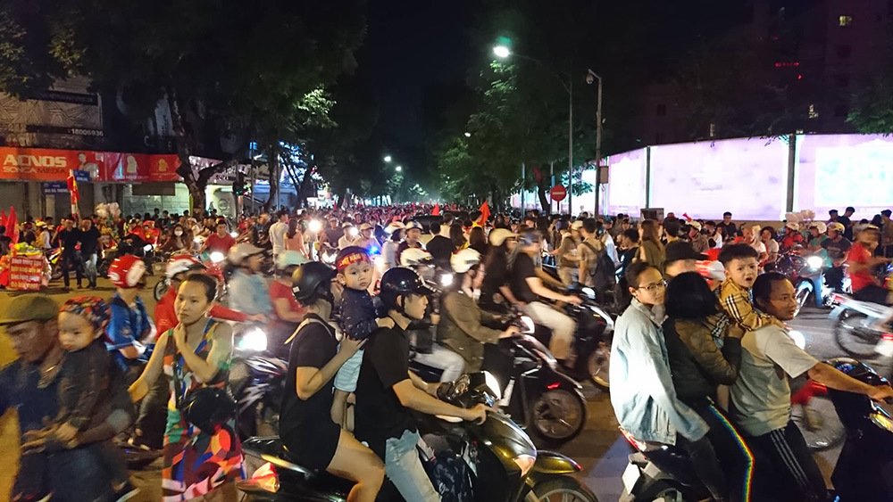 Người hâm mộ mang theo cờ Tổ quốc nhuộm đỏ các tuyến đường chính: Hai Bà Trưng, Hàng Bài, Bà Triệu, Tràng Tiền, Tràng Thi... Người người hô vang khẩu hiệu "Việt Nam vô địch", vừa phất cờ vừa đánh chống, khua chiêng.