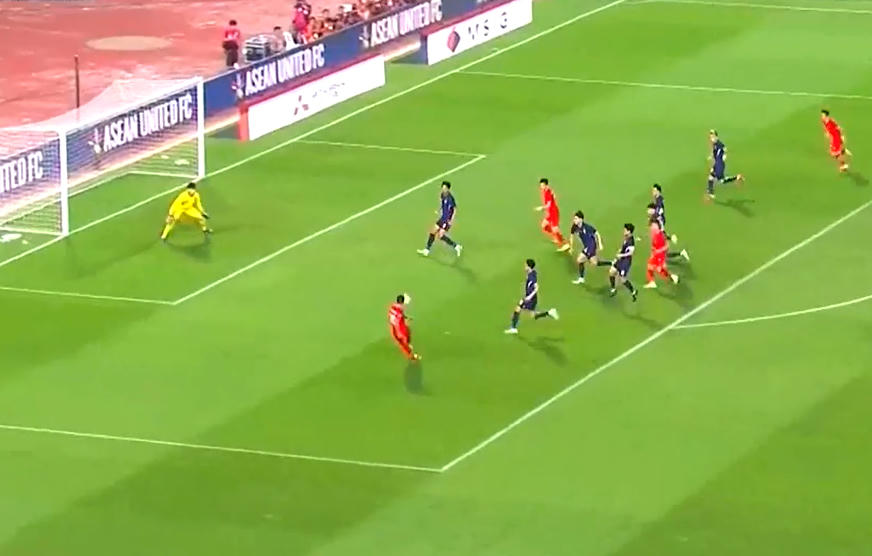 Một lợi thế rất lớn cho đội tuyển Việt Nam. Ngay sau đó Xuân Son có cú đánh đầu rất hiểm sau cú chuyền bóng của Văn Thanh, rất tiếc bóng đi chệch cột dọc.