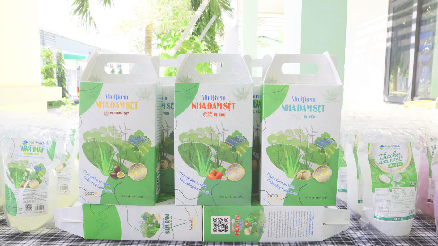 Ngoài thạch nha đam, để khai thác chuỗi giá trị và nâng cao giá trị sản phẩm, VietFarm còn đa dạng các sản phẩm hóa mỹ phẩm cao cấp chiết xuất từ nha đam như nước rửa chén, nước lau sàn…