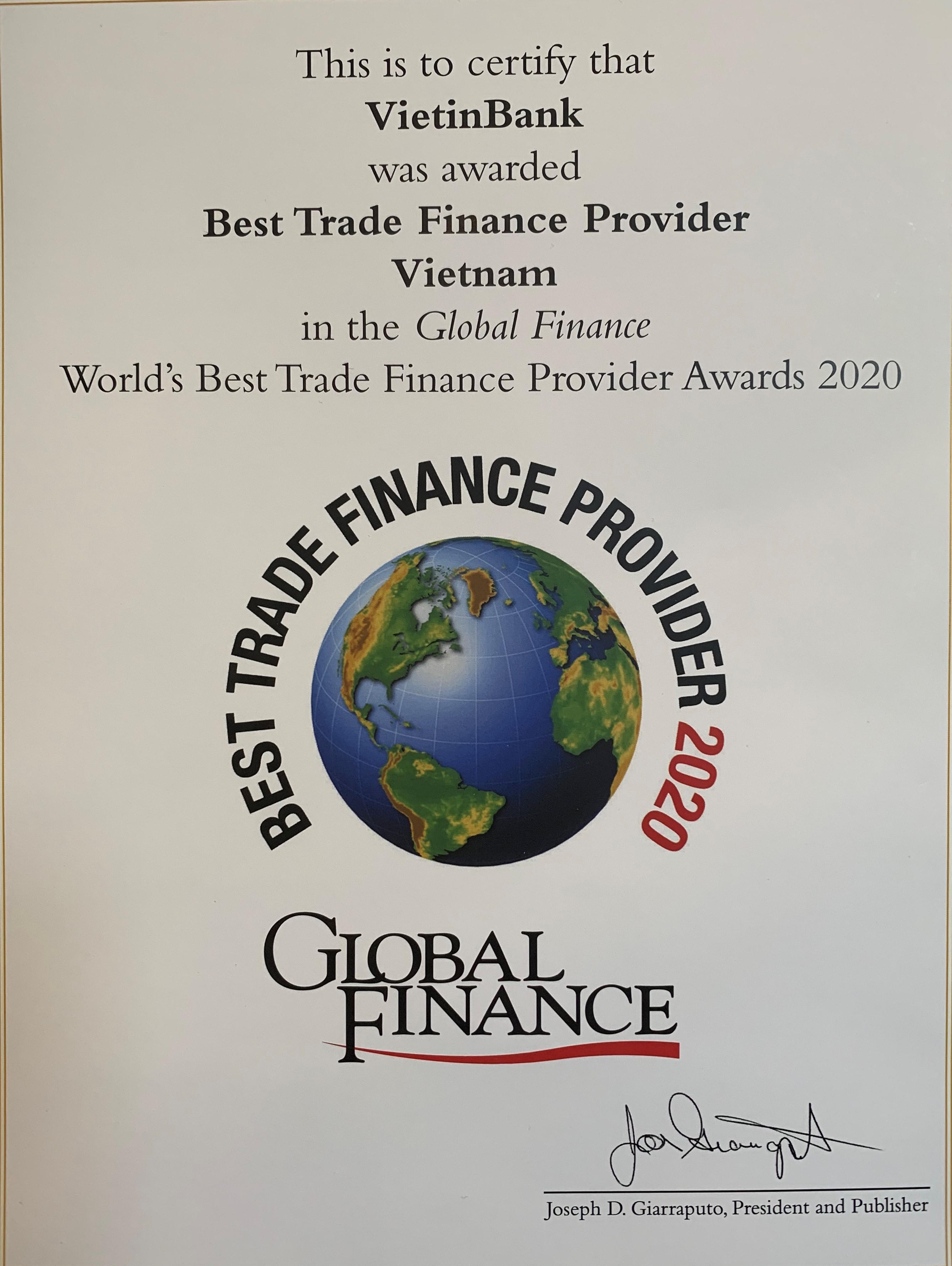 Giải thưởng “Ngân hàng cung cấp dịch vụ TTTM tốt nhất Việt Nam năm 2020 - Best Trade Finance Provider in Vietnam for 2020” lần thứ 3 liên tiếp do Global Finance trao tặng cho VietinBank là sự công nhận có giá trị lớn của giới tài chính quốc tế đối với những thành tích nổi trội về quy mô khách hàng, doanh số giao dịch, sản phẩm, dịch vụ đa dạng hướng tới khách hàng. Giải thưởng này một lần nữa khẳng định sự phát triển bền vững và chất lượng vận hành xuất sắc của VietinBank trong hoạt động TTQT và TTTM.