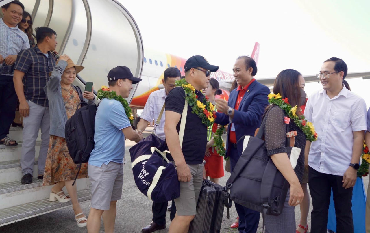 Phó Chủ tịch UBND tỉnh Đắk Lắk Võ Văn Cảnh (áo kẻ) và Phó Tổng giám đốc Vietjet Tô Việt Thắng (áo vest xanh) chào đón hành khách đến với Buôn Ma Thuột. |