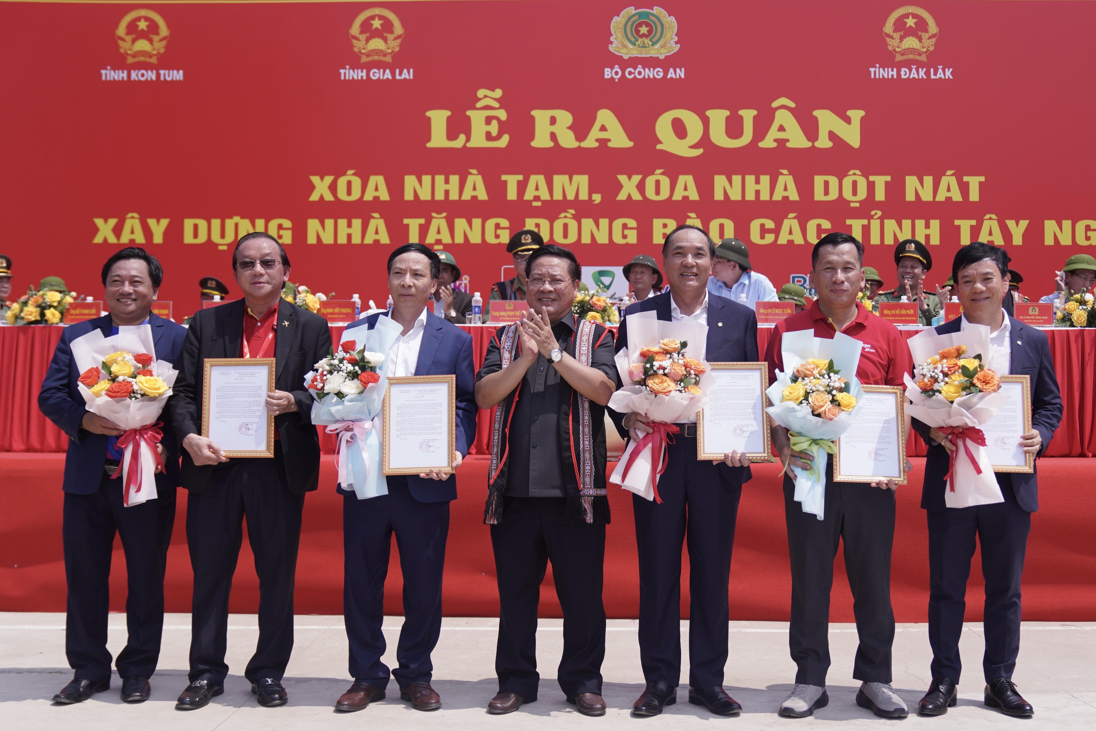 (PLVN) - Hãng hàng không Vietjet và ngân hàng số Vikki (Vikki Digital Bank) hôm nay đã trao phần quà hỗ trợ 500 căn nhà, trị giá 30 tỷ đồng cho các hộ nghèo, hộ cận nghèo trên địa bàn Tây Nguyên tại Lễ ra quân đồng loạt xây dựng, xoá nhà tạm, nhà dột nát cho hộ nghèo, hộ cận nghèo trên địa bàn các tỉnh Tây Nguyên và trao tặng nhà mẫu, bàn giao kinh phí hỗ trợ tại tỉnh Kon Tum do Bộ Công an tổ chức.