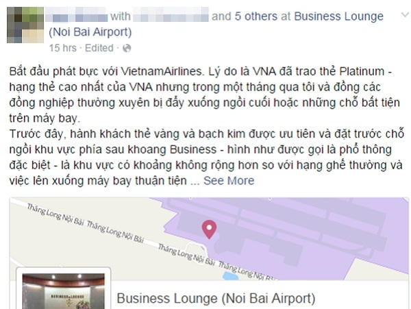 Theo đó, N.N cho rằng dù đã được Vietnam Airlines (VNA) trao thẻ Bạch kim (Platinum) - hạng thẻ cao nhất của VNA nhưng trong một tháng vừa qua, anh và các đồng nghiệp thường xuyên bị đẩy xuống cuối ngồi hoặc những chỗ bất tiện trên máy bay.