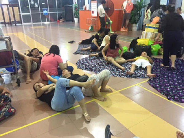 Những hành khách không đồng ý về lại Quy Nhơn đã phải ngủ tại sảnh của Cảng hàng không Sân bay Phù Cát, bất chấp cái nóng và muỗi đốt. Trong số này có cả người già và trẻ em.