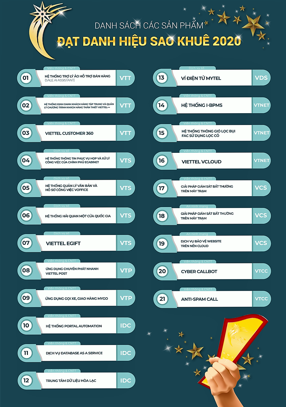 Trong Giải thưởng Sao Khuê 2020, Viettel tiếp tục là doanh nghiệp có nhiều sản phẩm dịch được vinh danh tại giải thưởng này với 21 sản phẩm đạt giải - tăng gần gấp đôi số lượng sản phẩm đạt giải so với năm 2019. Đây cũng là năm Viettel có số lượng sản phẩm tham dự và đạt giải cao nhất từ trước đến nay.