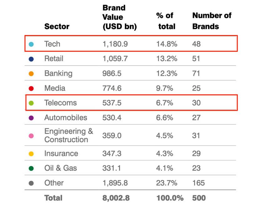Trong 500 thương hiệu giá trị nhất thế giới năm 2023, chỉ có 30 tập đoàn viễn thông trên toàn cầu nằm trong danh sách, chiếm 6,7%, giảm 6 thương hiệu so với năm 2022.