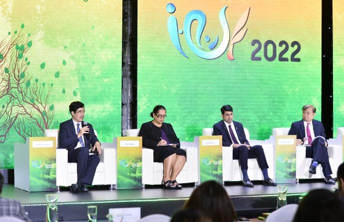 Ông Nguyễn Quốc Khánh (ngoài cùng, bên trái) - Giám đốc Điều hành Nghiên cứu & Phát triển (R&D) Vinamilk cùng các diễn giả trong phiên thảo luận VCSF 2022. |