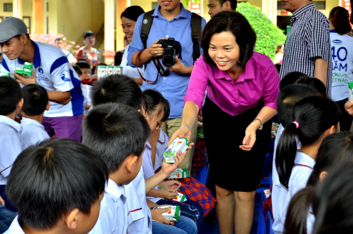 | Bà Bùi Thị Hương – Giám Đốc Điều Hành Vinamilk trao tặng sữa trực tiếp cho các em học sinh trường tiểu học Ninh Xuân, huyện Hoa Lư, Ninh Bình |