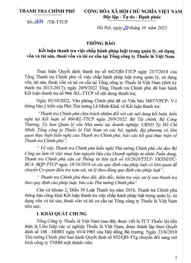 Thanh tra Chính phủ vừa ban hành thông báo kết luận thanh tra việc chấp hành pháp luật trong quản lý, sử dụng vốn và tài sản, thoái vốn và tái cơ cấu tại Vinataba.