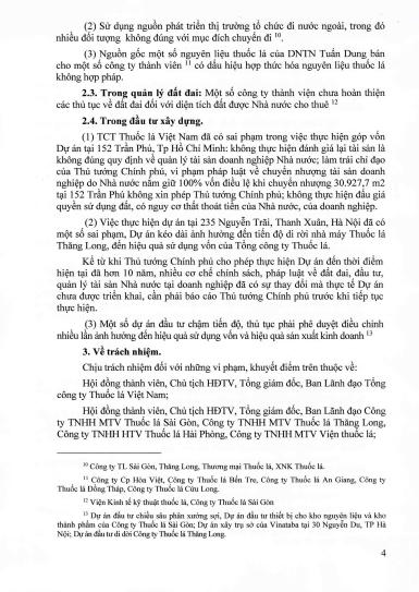 Kết luận Thanh tra khẳng định: Vinataba không thực hiện đánh giá lại tài sản là không đúng quy định về quản lý tài sản doanh nghiệp Nhà nước; làm trái chỉ đạo của Thủ tướng Chính phủ, vi phạm pháp luật về chuyển nhượng tài sản doanh nghiệp do Nhà nước nắm giữ 100% vốn điều lệ khi chuyển nhượng 30.927,7m2 tại 152 Trần Phú không xin phép Thủ tướng Chính phủ; không thực hiện đấu giá quyền sử dụng đất, có nguy cơ thất thoát tiền của Nhà nước, của doanh nghiệp; Một số dự án đầu tư chậm tiến độ, thủ tục phải phê duyệt điều chỉnh nhiều lần, ảnh hưởng đến hiệu quả sử dụng vốn và hiệu quả sản xuất kinh doanh…