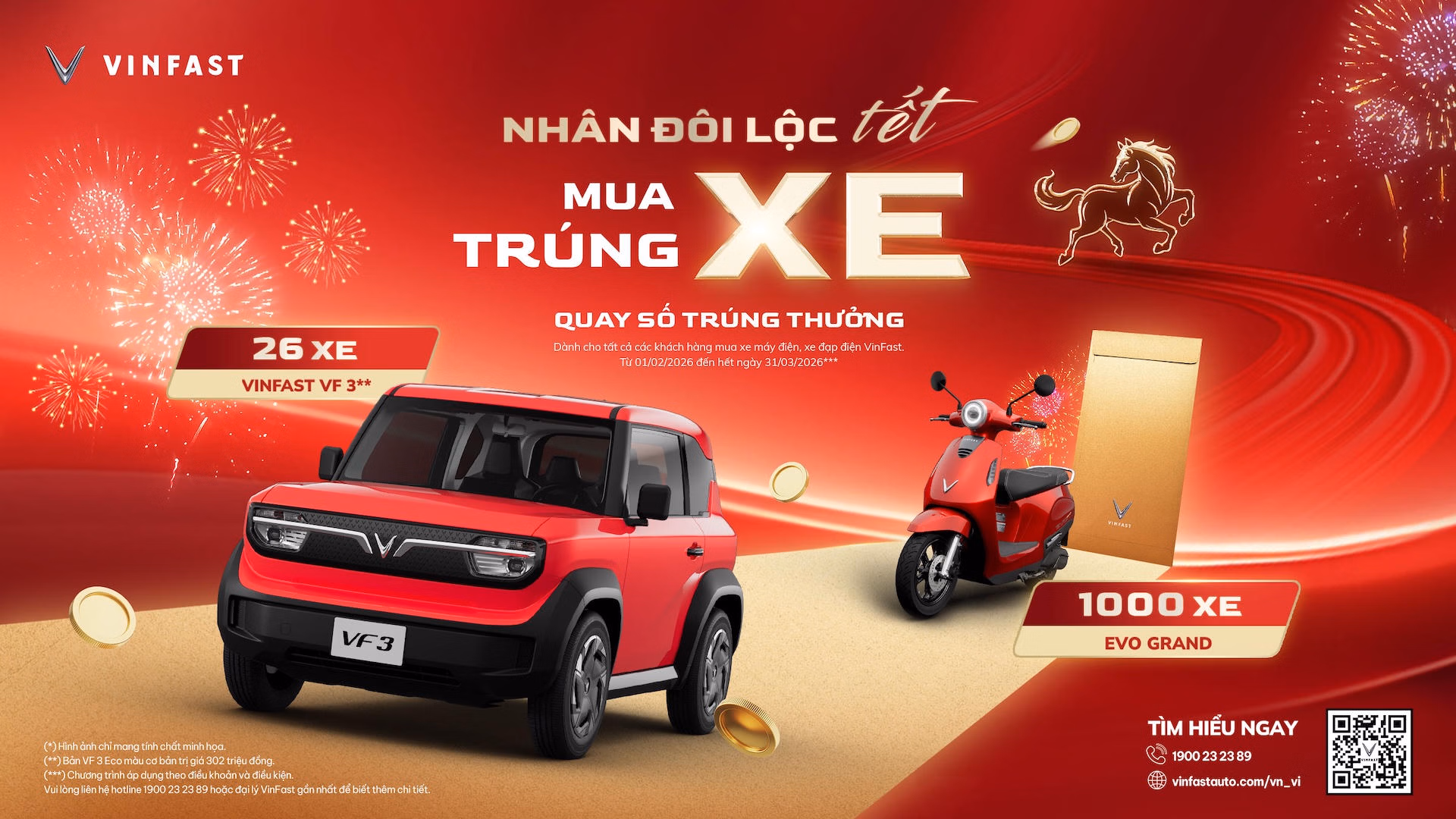 Ngày 31/1, chào Xuân Bính Ngọ và tiếp nối chiến dịch “Mãnh liệt vì tương lai xanh”, VinFast chính thức triển khai chương trình “Nhân đôi lộc Tết - Mua xe trúng xe” dành cho tất cả khách hàng mua xe máy điện từ ngày 01/02 đến 31/03/2026. Khách hàng có cơ hội bốc thăm trúng thưởng 26 ô tô điện VF 3 và 1.000 xe máy điện Evo Grand, với tổng trị giá lên tới trên 30 tỷ đồng, qua đó nhân đôi niềm vui chuyển đổi xanh nhân dịp Tết đến Xuân về.