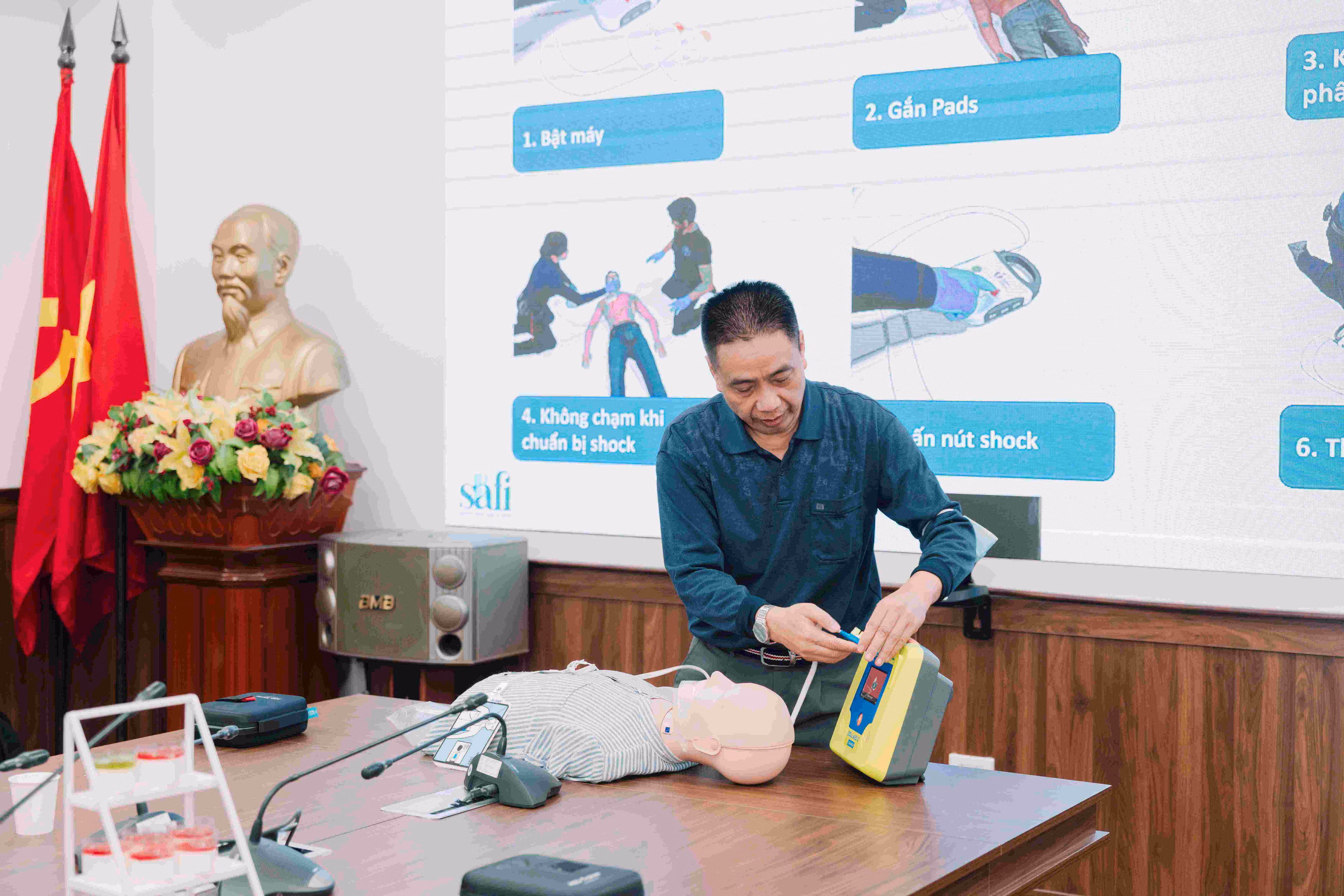 Theo đó, chuỗi tập huấn sơ cấp cứu cộng đồng được triển khai tại các cơ quan, địa phương trên phạm vi toàn quốc. Chương trình đầu tiên tổ chức tại Cục Quản lý Khám, chữa bệnh, Bộ Y tế, với sự tham gia giảng dạy của GS.TS.BS Nguyễn Gia Bình - Chủ tịch Hội Hồi sức Cấp cứu và Chống độc Việt Nam, cùng đội ngũ chuyên gia trong lĩnh vực hồi sức và sơ cấp cứu.