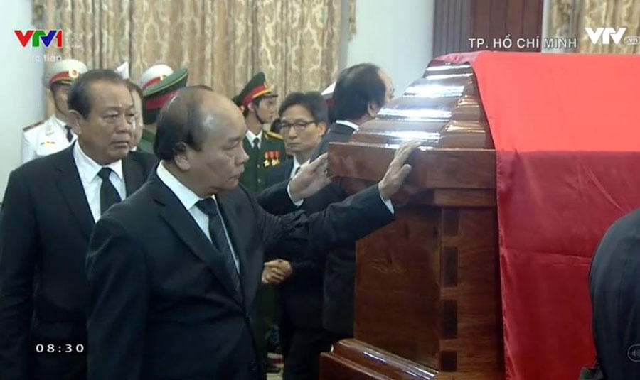 Các lãnh đạo Đảng, Nhà nước lần cuối chạm vào linh cữu, vái chào tiễn biệt nguyên Thủ tướng Phan Văn Khải và nắm chặt tay chia buồn với thân nhân, gia đình ông.