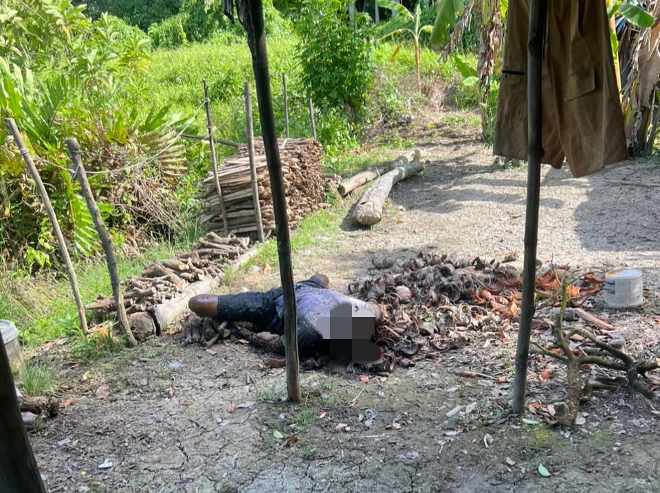 Ông T tử vong trước căn chòi giữ vườn (ảnh Công an Cung Cấp). |