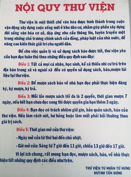 Bà Lời vợ ông Hưng chia sẻ: “Vì gia đình mưu sinh bằng nghề nông, hầu như suốt ngày vợ chồng tôi phải ở ngoài đồng để chăm sóc vườn và rau màu nên không có thời gian túc trực thường xuyên ở thư viện. Trong khi đó, mọi người đến thư viện ngày càng đông nên chúng tôi quyết định dỡ bỏ cửa nhà để người dân có thể tự do vào đọc và mượn sách. Tối đến thì vợ chồng tôi ngủ kế các kệ sách, đến nay tính ra cũng đã gần 20 năm nhưng không bị mất trộm thứ gì.