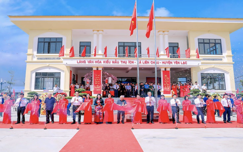 Các đại biểu cắt băng khánh thành tổ hợp văn hóa, thể thao Làng văn hóa kiểu mẫu thôn Thụ Ích. (Ảnh: BTC) |
