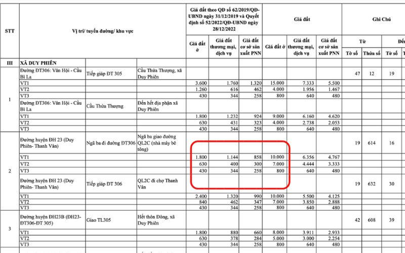 Đáng chú ý, tại bảng giá này, xã Duy Phiên, huyện Tam Dương là địa phương có giá đất ở tăng gấp khoảng 11,1 lần mức giá cũ. Cụ thể, tại vị trí số 2 đường huyện 23 Duy Phiên – Tam Dương, với giá hiện hành 2019 là 630 nghìn đồng/m2, mức giá sau điều chỉnh là 7 triệu đồng/m2.