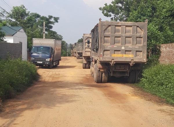 Xe tải chở đất xếp hàng nối đuôi nhau làm cản trở giao thông người dân. |