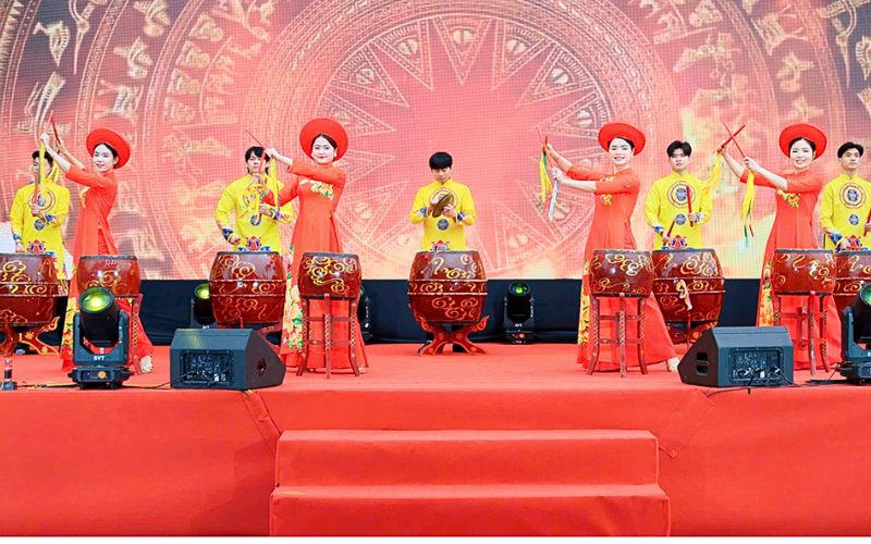 | Tiết mục trống hội khai xuân. Ảnh: Kim Ly |